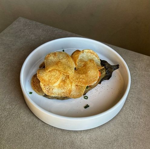 Мусака с креветками и картофельными чипсами