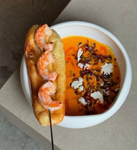 Крем-суп Тыквенный с креветками и лепешкой из дровяной печи