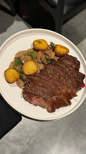 Стриплойн с соусом из диких грибов и бейби картофелем