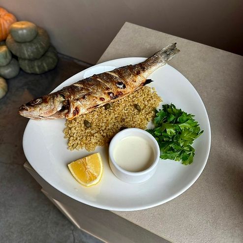 Целый сибас с булгуром