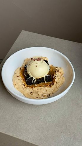 Финиковый брауни с муссом из вареной сгущенки и ванильным пломбиром