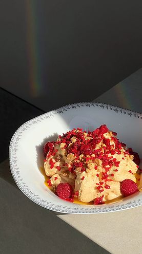 Мусс из вареной сгущенки с малиновым сорбетом и жареным белым шоколадом