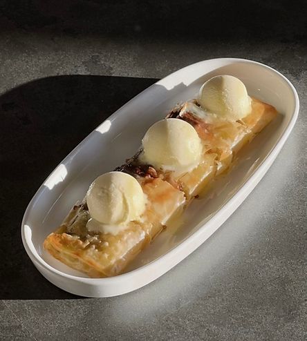 Халва с финиками, шоколадным кремом, и оливковым мороженым