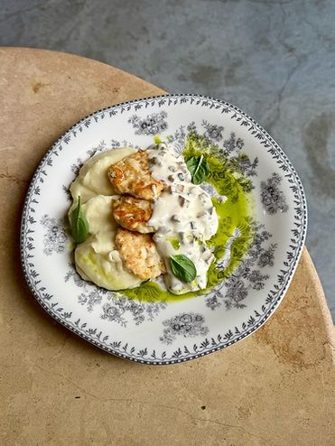 Куриные оладьи с пюре и грибным соусом