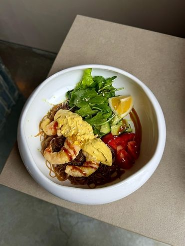 Боул с фунчозой и креветками в кляре