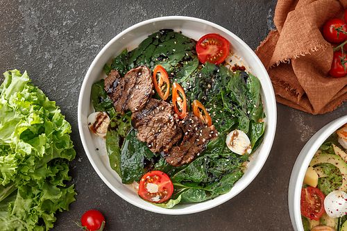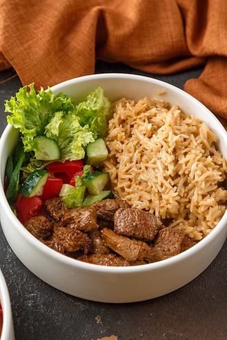 Сливочный рис с мясом и овощным салатом