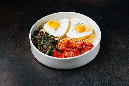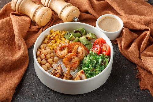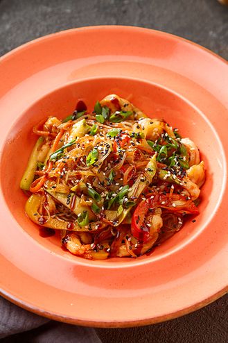 Боул с креветками и фунчозой