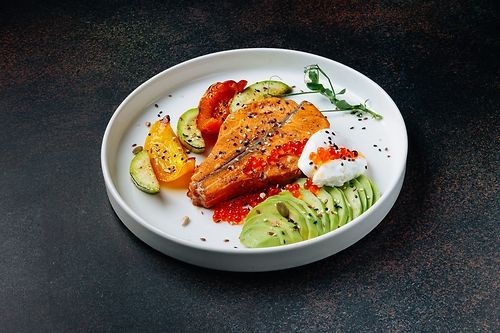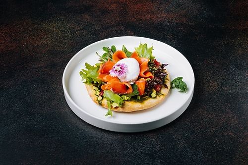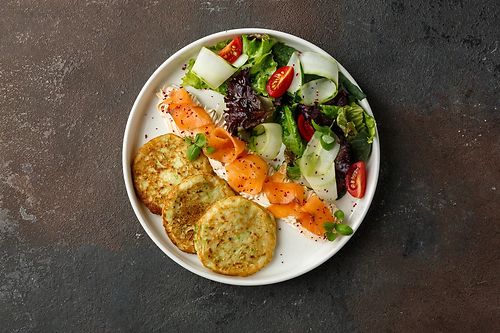 Оладьи кабачковые с сёмгой и салатом